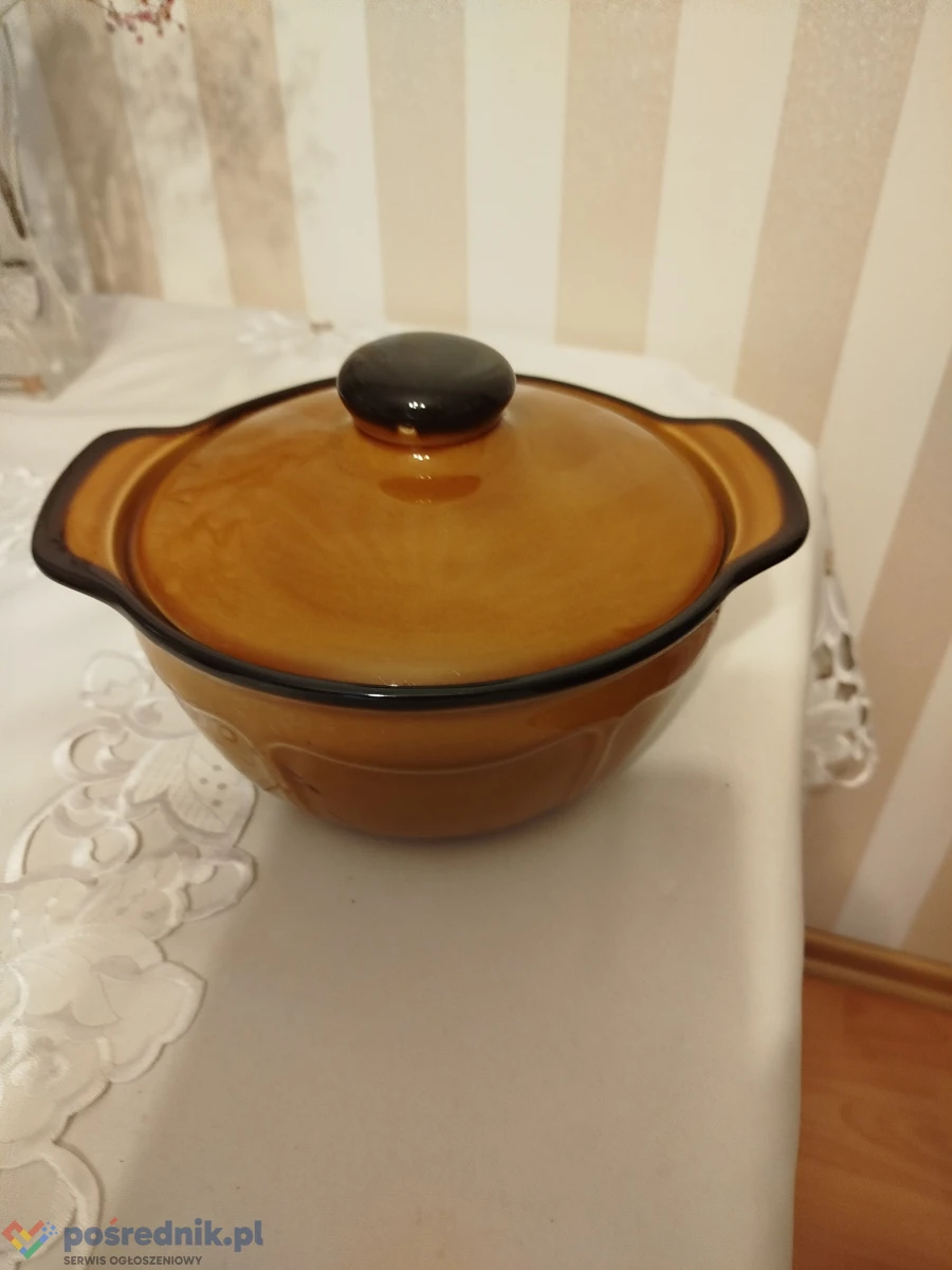 Sprzedam wyroby kuchenne w stylu ludowym w tonacji brązu. Są to -waza na zupę sred.20 cm szer. z uszkami 25 cm ,dzbanuszek, dwojaczki z malowanym motywem ludowym wys.13 cm. dl. 23 cm i przybory kuchenne :;. łyżki i tłuczek do zawieszenia dł. 28 cm na wieszaczku